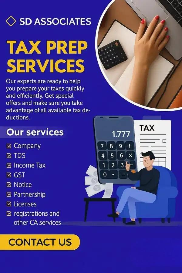 Edit Best Accounting & Tax Services SD Associates Chartered Accountant Services Income Tax GST TDS & Registration Home Classifieds Business Services Accounting & Tax Services SD Associates Chartered Accountant Services I Report Spam Spam Confirmation Why do you want to mark as Spam? Mark Fav. Email Friend Email a Friend Copy URL 29 Apr 2026 11:25 AM 8 views storygrid, An Individual Contact User Send Email to Seller No Phone number Chennai, TN Otteri, Chennai, Tamil Nadu Classified Listing Type Service(s) offered Service(s) offered Income Tax GST TDS & Registration Experience (in year(s)) 0 Working days Monday,Tuesday,Wednesday,Thursday,Friday Contact Person SD & SM ASSOCIATES SD Associates provides complete CA services for tax, GST, TDS, and business registrations. We offer accurate, timely, and hassle-free support for individuals and businesses. Contact us for reliable tax and compliance solutions. Tags #sdassociates #caservices #incometax #gstservices #tdsfiling #itrfiling #accountingservices #taxconsultant #companyregistration #financialservices #compliance TRENDING Mahadev Finance – Achieve Your Dreams with Easy Personal, Business & Home Loans