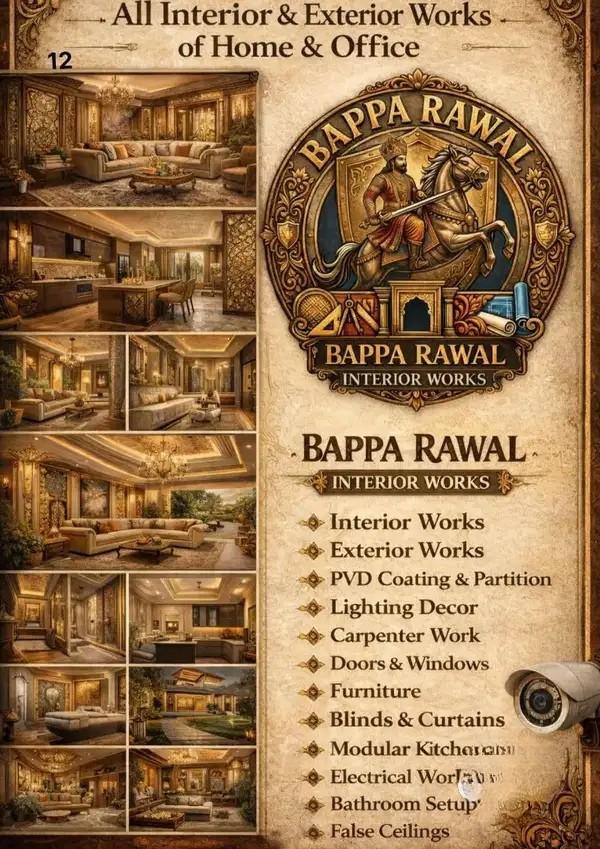 Bappa Rawal Interior Works provides complete interior and exterior solutions for homes and offices with premium quality and elegant designs. We specialize in interior decoration, exterior works, PVC coating and partitions, lighting décor, carpenter work, furniture design, doors and windows installation, blinds and curtains setup, modular kitchens, electrical works, bathroom setups, and false ceilings.