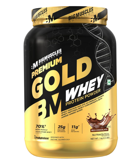 Boost your fitness journey with BigMuscles Nutrition Premium Gold Whey Protein (1Kg), a high-quality protein supplement specially formulated to support muscle growth, strength, and faster recovery after workouts.